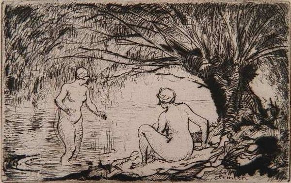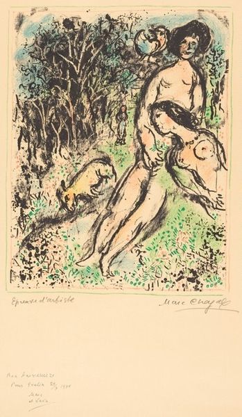 Curator: I find Lovis Corinth’s “Letter A: Adam, Where Are You?” hauntingly beautiful. There's a rawness to its monochrome palette that really underscores the figures' vulnerability. Editor: The first thing that strikes me is its graphic quality. It’s not just a depiction but a construction, that bold 'A' framing Adam and Eve, drawing attention to the medium itself. What sort of paper and graphite do you think he employed here to achieve such bold effects? Curator: Knowing Corinth, I imagine he chose materials that would allow for rapid, expressive strokes – something almost visceral. It’s like he's reaching back into the very origin of things, questioning the nature of innocence lost. Editor: Indeed. The swiftness with which he seems to have worked is palpable, emphasizing the labor and physicality of the drawing process. This feels less like a biblical illustration and more like an exploration of artistic and human origins, wouldn't you say? Curator: Absolutely. Corinth wrestles with the story. It’s not just a retelling; it's an excavation of his own doubts and, perhaps, a search for grace in a world rapidly losing its own. Editor: Precisely, and by foregrounding the means of creation—the paper, the pencil, the artist's hand—he brings this primordial narrative crashing into the material realities of his time. Curator: That's a profound observation; it’s as though the Fall becomes a metaphor for the artist’s own struggle with the burden of representation. Editor: It is a fitting end, I think, to our brief journey through the looking glass of art's origins and material manifestations.