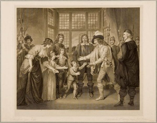Editor: This print, "Interview of Charles I with His Children" by William Sharp, presents a poignant scene. The tonal range creates such a somber mood. What do you notice about the composition? Curator: The artist's expert use of chiaroscuro is quite notable. Observe how Sharp masterfully modulates light and shadow to emphasize the emotional core of the scene, particularly the figures of Charles I and his children. Editor: That’s a fascinating observation. I hadn't considered the light's role in emphasizing the relationship between the figures. Curator: Indeed. The strategic arrangement of the figures within the frame reinforces the narrative and evokes a sense of formal austerity. A careful study of line and texture lends itself to a deeper appreciation. Editor: I see now. It’s amazing how much can be gleaned from analyzing the formal elements.