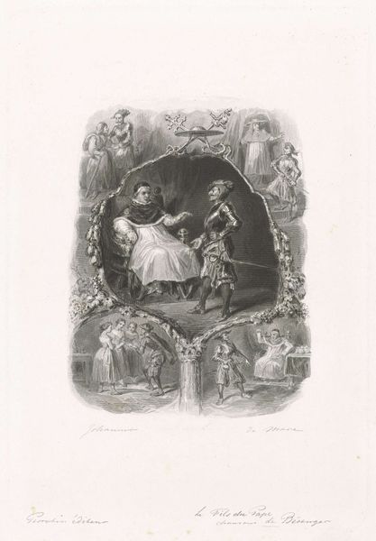 Johannes de Mare created this print called 'Man in harnas voor een paus' – or ‘Man in armour before a Pope’ - sometime in the 19th century. Here we see a Pope in his papal robes, seated in a grand chair, in conversation with a man in armour. Surrounding them are other figures, seemingly frozen in moments of drama. The image invites us to consider the complex relationship between religious authority and military power. It was a fraught dynamic at this time in European history. The print hints at the tension between spiritual leadership and the worldly concerns of power, protection and conflict. To understand this image better, we might delve into historical archives, exploring the political intrigues and power plays of the 19th century. Art, after all, is not created in a vacuum, but in a specific social and institutional context.