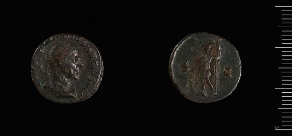 Curator: Here we have a Denarius of Elagabalus, part of the Harvard Art Museums collection, a coin showcasing a portrait of the controversial Roman emperor. Editor: It looks so small and worn, yet brimming with power. Silver, I imagine? The images are striking, even in this state of decay. Curator: Indeed. Elagabalus's reign was marked by religious reform and social upheaval. The coin presents his image, but also points to his attempt to impose the cult of Sol Invictus, represented by the deity on the reverse. Editor: So, these aren't just portraits; they're ideological statements, carefully chosen symbols crafted to legitimize power and project a certain persona. The sun god, then, becomes a visual tool. Curator: Precisely. And the numismatic evidence offers vital insight into the strategies Elagabalus employed to shape public perception. It failed, of course, and he faced severe backlash for his radical religious policies. Editor: It's fascinating how such a tiny object can hold so much historical weight, revealing the intersection of power, religion, and identity in ancient Rome. Curator: Absolutely. It's a potent reminder that material culture can provide invaluable perspectives on marginalized or misrepresented figures throughout history.