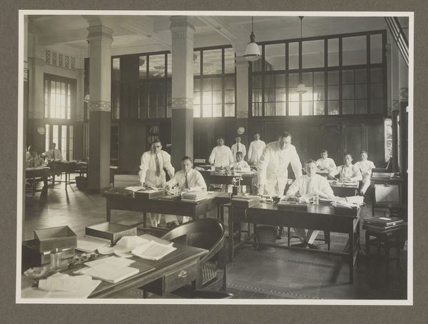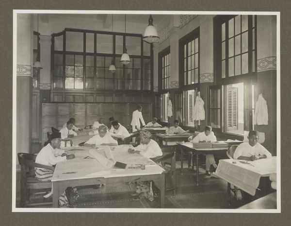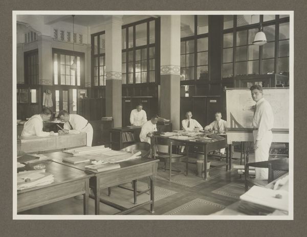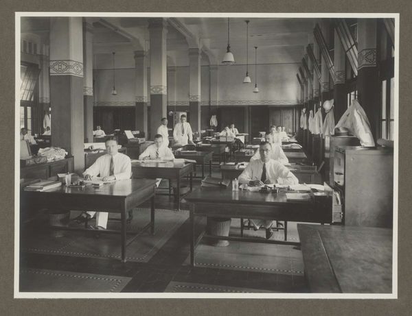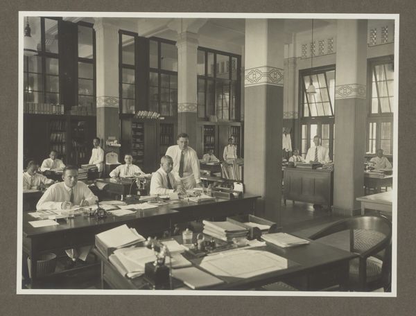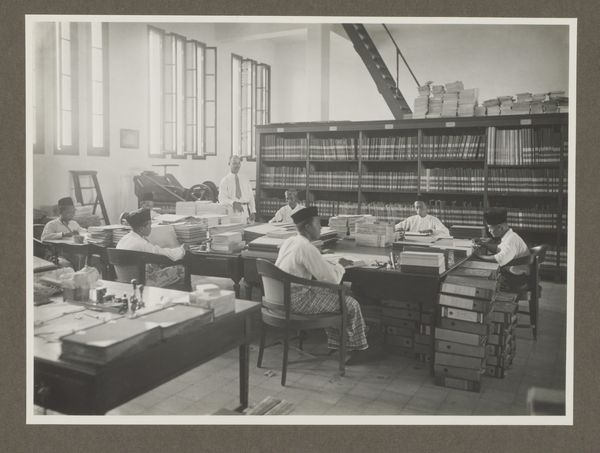 Atelier Kurkdjian created this photograph titled 'Secretariaat' sometime in the 20th century. It's like stepping back in time, isn't it? The composition is so meticulously arranged, with these lines of desks receding into the distance. Each person seems absorbed in their work, yet part of a larger whole. The tonal range feels both stark and subtle. It is reminiscent of the work of Bernd and Hilla Becher, who approached their photographic work as a means of cataloging and documenting various examples of industrial architecture. It makes me think about how much labor goes into creating art, and also how much labor is involved in the everyday, often unseen work that keeps society moving. Like how an artist layers paint, these people were layering actions and decisions that shaped the world. It gives me a feeling of reverence, and the composition is very satisfying to look at.