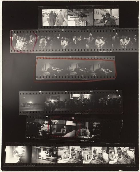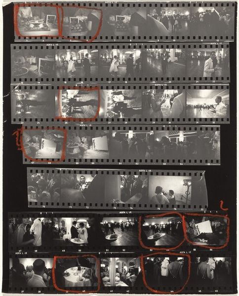 Robert Frank's "Venice, Italy 32" is a gelatin silver print comprised of multiple frames, capturing a series of moments in stark black and white. The images show what seems to be crowds of people dressed formally in indoor and outdoor settings. The structure of the film strip itself is a key component here. The frames offer a sequential, almost cinematic glimpse into events, yet the interrupted flow forces us to consider each image as a separate, self-contained unit. Frank challenges traditional photography. It is no longer a straightforward depiction of reality. The high contrast intensifies the emotional impact, heightening our sense of the dynamic interplay between light and shadow, presence and absence, public and private. The materiality of the print—the graininess and tonal gradations—further reinforces the photograph's subjective nature. Frank asks the viewer to question the narrative and engage in a semiotic interpretation that reflects both cultural and personal experience.