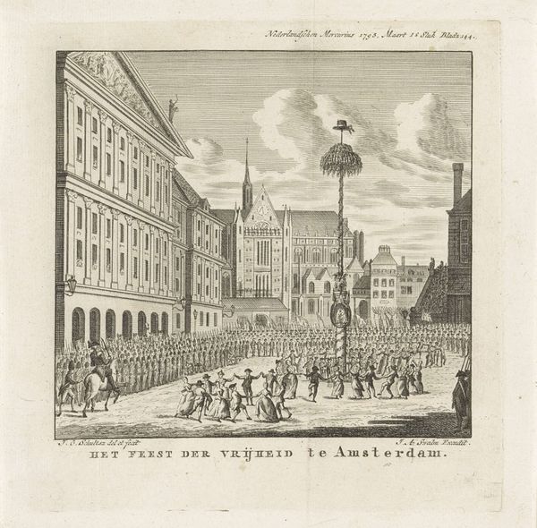 Willem Kok created "Feest der Vrijheid op de Dam te Amsterdam, 4 maart 1795" using engraving techniques. Notice how Kok structures the scene using the architecture as a framing device. The stark contrast between light and shadow renders the scene with a documentary feel, yet look at the complex interplay between architectural grandeur and the swarming figures below. This contrast creates a dynamic tension, inviting us to consider the shifting socio-political landscape. Kok uses the classical architecture of the buildings as a structural element to symbolize order and tradition, but he juxtaposes them with the chaotic crowd, suggesting societal transformation. The strategic use of linear perspective draws us into the heart of the Dam Square, encouraging us to reflect on freedom and revolution. The artwork destabilizes traditional representations of power, and the ordered depiction of a spontaneous moment reflects a changing world.