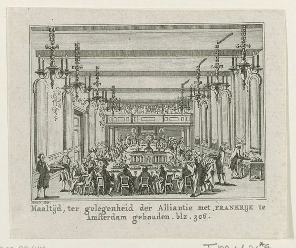 Editor: This is an engraving from 1732 titled "Overleg door de Staten-Generaal over het aanstellen van een Roomse vicaris in Nederland" which translates to "Deliberation by the States General on the appointment of a Roman vicar in the Netherlands." The whole scene has a formal, almost staged feel. It’s all very grand, from the architecture to the subject matter being depicted. How do you read this image? Curator: Well, the architectural space itself speaks volumes. The "Saal van de Staaten Generaal," as the engraving labels it, isn't just a room. It’s a container of cultural memory, deliberately opulent. Think about the ceiling frescoes – they are not mere decoration. The overall composition reinforces this with its linear emphasis. How does the depicted moment of the Roman vicar engagement tie into Netherlands identity? Editor: You mean the conflict between the Protestants and the Roman Catholics back then? It's subtle here, but I see how the discussion around appointing a Roman vicar could touch on issues of Dutch identity, tolerance, and state authority, right? Curator: Precisely. This scene also highlights the Dutch Republic's struggle to balance religious freedom with political stability. But think, too, of the individuals depicted; though realistically rendered they embody ideals. Look at the text included at the bottom of the engraving; the characters named become figures. Notice that these individuals are symbolic, participating in the ongoing theater of governance. Editor: I do notice how it is "staged," yet real people are presented. I’m starting to understand how this historical scene carries all this emotional and political weight beyond its mere visual representation. Curator: Absolutely. By meticulously depicting this event, the artist tapped into the symbols that would resonate with contemporary audiences and ensure the story’s survival. Consider the symbolism embedded within the visual elements, like those ornate walls, a powerful tool to communicate ideas. What a memory we create! Editor: It’s a good reminder to always consider the cultural memory and societal context when analyzing artworks. I have to admit that there’s more to it than meets the eye. Curator: Indeed, and this work stands as a beautiful bridge between the historical moment and our modern understanding.