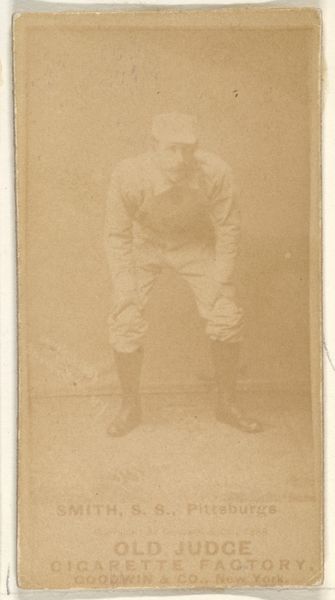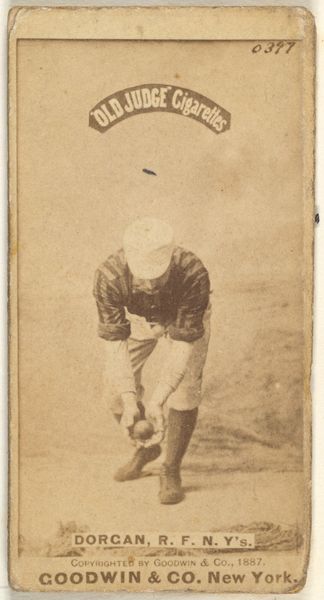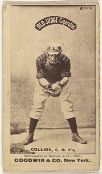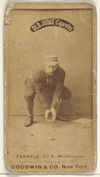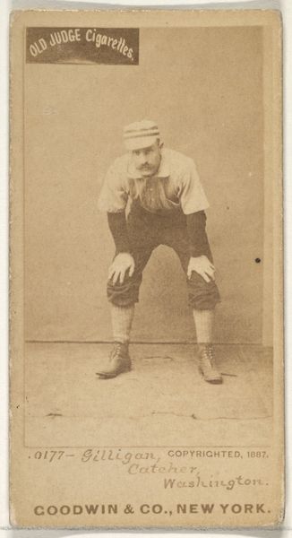 Editor: So, this is a photograph from 1887 by Goodwin & Company, titled "Michael 'Mike' Joseph Mattimore, Pitcher, New York," part of the "Old Judge" series for Old Judge Cigarettes. The sepia tone gives it such an antique feel; he almost looks like he's about to leap off the card! What do you notice about the symbolism or cultural weight of this baseball player as a subject, Curator? Curator: The first thing that strikes me is how intertwined the concepts of celebrity, sport, and commercialism were, even at this early stage. Note the “Old Judge Cigarettes” advertisement looming above Mattimore’s image. Baseball cards such as this one are powerful symbols, aren't they? These images conferred a kind of immortality and a widespread recognizability to figures who were, essentially, working-class heroes. They became archetypes. Editor: Archetypes… that’s interesting. I suppose that connects to the product, offering a similar sort of aspirational appeal for the consumer. But what does Mattimore *himself* symbolize? Curator: Consider his pose – crouched, ready, in that charged moment before action. It reflects anticipation, readiness for battle, even a little bit of hope. This links to broader themes of American striving. Consider the late 19th Century was a period of rapid industrialization. Sporting heroes became increasingly important symbolic figures, emblems of health and vitality in an era of growing anxieties around modernity. Would you agree? Editor: Definitely. I guess I hadn't thought about how the image itself ties into that era's values so directly. Curator: Yes. Through its pose and place, the baseball card provides a capsule image for how America chose to represent itself. Now you see, how even ephemera gains greater substance. Editor: It's amazing how much is packed into one tiny image! Thanks so much for your perspective!