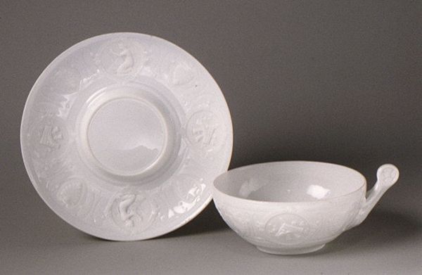 This saucer was produced by the New England Pottery Company sometime between 1876 and 1914. It is more than a simple dish, it's a window into the burgeoning American ceramics industry. The New England Pottery Company, like many others at the time, was striving to compete with European manufacturers. They needed to create affordable wares for a growing middle class that still evoked luxury. The gilded edge and delicate fluted design of this saucer speak to that aspiration. Ceramics factories in the United States at this time had to negotiate issues of labor relations, factory conditions, and the cultural politics of taste. Advertising played a large part in shaping consumer desire, and objects like this saucer became important symbols of domestic comfort and social status. By researching company records, period advertisements, and social histories of the era, we can understand the complex web of social, economic, and artistic factors that shaped this seemingly simple object.