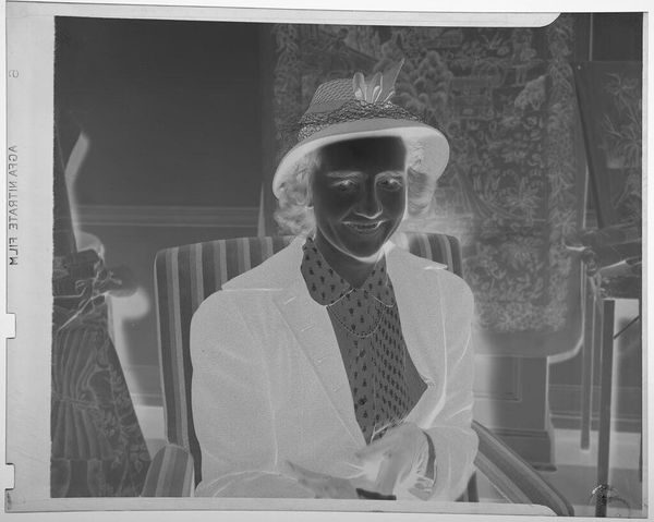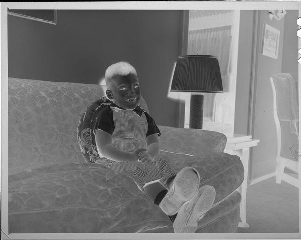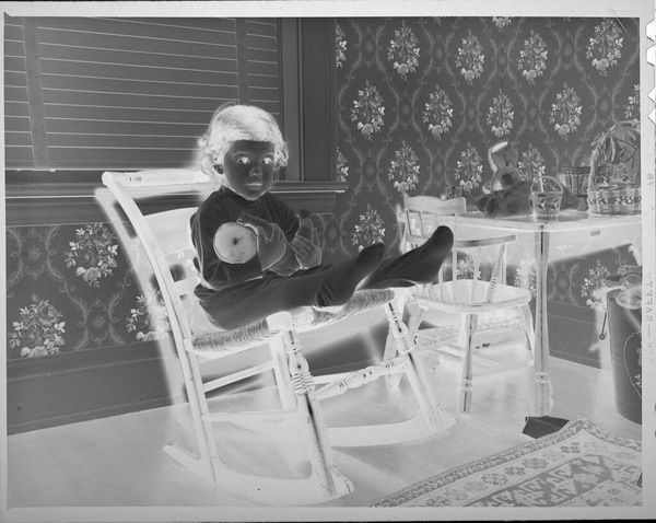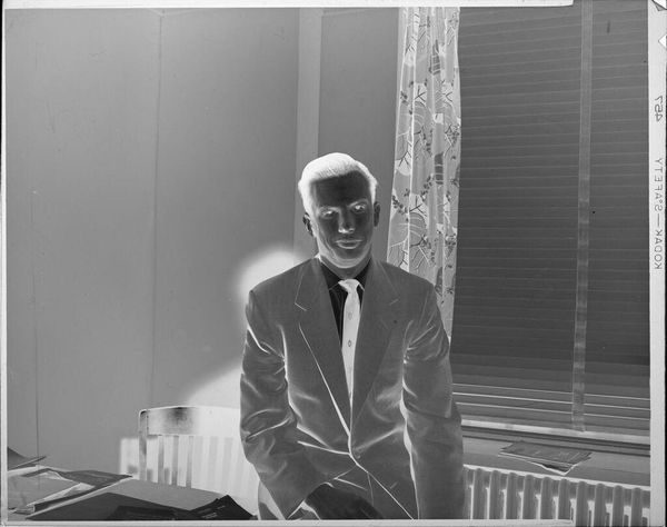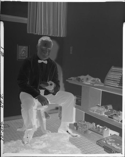 Editor: This gelatin silver print, "Untitled (man with puppets)" by Ken Whitmire Associates, shows a man formally dressed but holding puppets. The inverted colors give it a strange, almost dreamlike quality. What’s your take on this image? Curator: It's interesting to consider the intersection of performance and identity here. The man’s formal attire contrasts starkly with the playful puppets, immediately raising questions about the roles we perform and the masks we wear. Are we seeing a commentary on societal expectations of masculinity? Editor: That’s a great point. The puppets almost seem to mock the formality. Curator: Exactly. And in the context of the time it was created, what statements might it be making about class and race, given the staging within the domestic space? Editor: I hadn't thought of it that way. Now I see it as a more complex statement about identity. Curator: Precisely, it invites us to unpack those complexities.