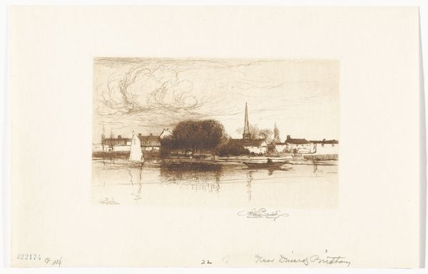 Curator: This is Carel Nicolaas Storm van 's-Gravesande's etching, "Dorpsgezicht in Kinderdijk," created around 1887. It currently resides here at the Rijksmuseum. Editor: My first impression? Quietude. It feels like a scene holding its breath. The muted tones create a certain solemnity, like a memory fading at the edges. Curator: 'S-Gravesande was quite the proponent of etching; he thought it the most immediate way for an artist to express themselves, more so than painting. He would even go out on his bike, with his etching equipment strapped to the back. Editor: And I can sense that immediacy here, in the sketchy, almost nervous lines. The way he captures the light on the water is quite beautiful. It’s interesting how the composition, with the emphasis on the waterways, speaks to Kinderdijk’s historical role. The entire place relies on water management for its very survival, it is after all famous for its windmills. Curator: Absolutely. While Impressionism informs his style to an extent, there’s also a groundedness to it. The etching, although light, focuses heavily on structures such as buildings and, what look to me like, early river defenses, reminding us of the solid presence and architectural achievements of Dutch civilisation. It grounds the dreamy aesthetic we so often associate with art of this period. Editor: Yet, at the same time, there's this lone figure walking alongside the river… almost blending in with the muted tones. They're framed by these robust buildings and a sky filled with foreboding—suggesting themes of both community and isolation? I wonder if, from a more political angle, the contrast between the strong architectural background and that figure hints at the impact urban developments were having on everyday individuals. Curator: Hmm, interesting. For me it shows that we are alone together on our own individual path despite living amongst and next to each other. Which is an interesting thought when considering Dutch painting. But, perhaps it shows we should never assume what an artist means. Maybe that is a great part of the beauty? Editor: I agree, perhaps 's-Gravesande wasn't overtly making any statement. It reminds us that context always reshapes our interpretations and we might be looking to our present for our art meaning when actually that can and will change throughout history. Curator: Precisely, like ripples from those distant boats gently disturbing the scene…art just sits there, reflecting our constantly shifting world.