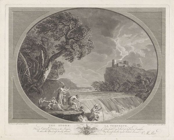 Curator: Looking at this print, "Main View of the City of the Pont de L'Arche near Rouen," it evokes a sense of tranquility, almost pastoral. The composition is quite striking. Editor: It's incredibly picturesque, isn't it? This print after a painting by J.P. Hackert, engraved by Charles Nicolas Dufour, really speaks to the era's obsession with the idyllic landscape, but I wonder how that ideal relates to the lived experiences of those who resided near the Pont de L'Arche. How did class and social structures affect the representation of landscapes in art? Curator: That's the exact tension that makes this piece so engaging. The figures in the foreground, seemingly leisurely, exist in stark contrast to the imposing architecture in the distance. Their narrative seems detached from the town itself. Editor: Exactly! The framing almost seems to distance the viewer from the realities of urban life. Considering the socio-political context of the time, the choice to highlight the natural landscape over the urban one becomes quite compelling. Curator: Right. It leaves me pondering the subtle commentary on power and privilege that Dufour, or perhaps Hackert, might have intended. Editor: Absolutely, a reminder that art is never created in a vacuum, always resonating within larger power structures.