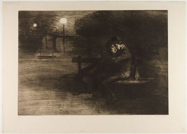 Curator: This is Jean-Louis Forain's "Lawyer Going through a Brief," an etching created around 1909. What strikes you first? Editor: The gloom. The scratching of the etching tool. It feels like secrets are being unearthed in a dimly lit corner, perhaps in some dusty archive. Curator: Exactly. Forain captured those moments when legal theatrics met backroom deals. This etching isn't just a portrait; it's a snapshot of societal undercurrents. The nervous client hovers behind, and all around, those frenzied cross-hatchings embody both frantic activity and murky motives. Editor: It is all frantic, isn't it? How was the print actually created? The image looks almost like nervously scribbled notes, capturing the transient anxieties of both the lawyer and client—not that the technique conveys moral judgment in itself, though. And were these prints widely distributed at the time? How affordable were they for different segments of society? Did this affect their role in shaping public perception of legal figures? Curator: Those are vital points. Prints like these gained prominence with industrial advances. I would suppose that, given the labor and the detail here, prints would have circulated among a class of bourgeoisie looking for reflections on Parisian life—critical ones perhaps. Editor: This begs the question, what kind of ink, paper, and press were used, and were the materials sustainable for widespread art consumption. Forain clearly wasn’t afraid to use the medium to its fullest potential. There is very little 'positive space,' and his textures create this shadowy world where you just can’t make out anything. I guess his social critiques didn’t come from nowhere... Curator: Yes, exactly. It feels like peeking into a world on the fringes, right? Forain sees the pathos there too; maybe it’s not quite ridicule. What I also appreciate about it is its incomplete and unfinished sensibility. Editor: Definitely. By foregrounding materiality and production processes, and integrating insights of art and labor history, one starts to see 'genre paintings' as enmeshed with technology and society. Curator: Precisely! It also reminds us that we, as viewers, come with our own social contexts—shaping how we perceive artworks such as this. The more angles, the better.