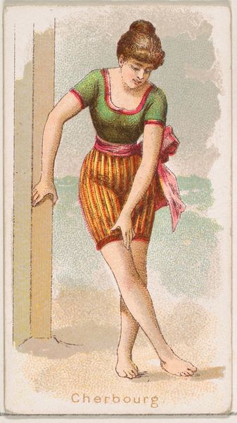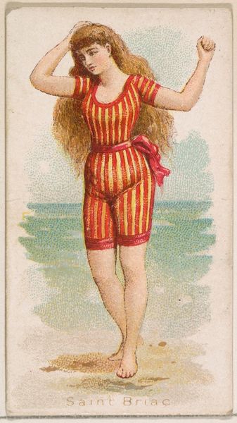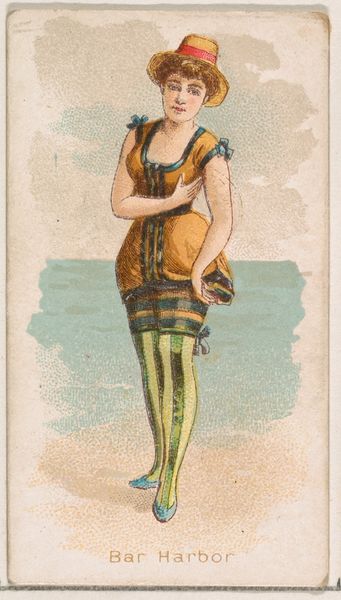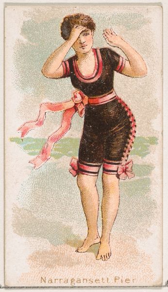 Curator: This is "Val Andre, from the Fancy Bathers series," dating to 1889, and produced by Wm. S. Kimball & Co. Editor: My initial impression is how small this artwork must be, judging from its delicate linework and the intimate quality of the portrait. The subject has a distant look on her face, giving the overall effect a sense of both longing and vulnerability. Curator: It’s quite diminutive – essentially a trade card! Made with colored pencil and print, it reflects the burgeoning commercial art market of the late 19th century and its fascination with popular imagery, especially these series focusing on feminine types. The availability and means of production influenced its widespread distribution as collectibles with cigarette packs. Editor: Fascinating. It seems the intersection of commercial interest, availability of the materials and production pushed it into every corner of society, shaping tastes. It raises interesting questions about artistic labour, class, and accessibility, doesn’t it? Who had the access to art, what were the common themes. Also, these are bathing suits for that time, which reveals an idea of beauty. Curator: Exactly. Kimball’s company distributed countless images, subtly shaping consumer culture through these small artworks. What do you think about its use of ukiyo-e principles? Editor: That influence adds another layer to its interpretation. It shows a transcultural adaptation where the ukiyo-e influence emphasizes linear grace while domesticating it for a Victorian-era sensibility, it’s interesting! The figure is idealized, the craftsmanship made affordable and available to the masses. It reflects a fascinating cross pollination, democratizing high-art techniques. Curator: Looking at this artwork makes one wonder about the other works of "Fancy Bathers Series" or just in general: which materials and themes were considered acceptable by audiences. How did the artists perceive their craft in relation to popular trends? Editor: Absolutely. This brief insight only makes us wonder where it stood in society, how it shaped our modern visual language and also how labor and consumption influence both artwork and artist!