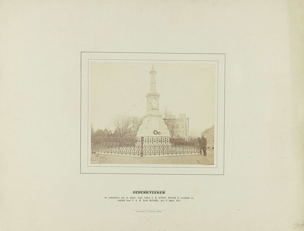 Editor: This is a photograph, probably from around the 1900s, depicting the "Monument voor de Nationale Onafhankelijkheid op Plein 1813 in Den Haag." It's a bit faded, giving it a distant, almost dreamlike quality. What can you tell me about it? Curator: Well, let’s think about the photograph itself. It is, in its own right, an object made through specific industrial processes in early photography. The monument, a massive construction presumably made of stone and bronze, is rendered here in a relatively mass-producible format. Does the act of photographing something monumental change our relationship to its implied power? Editor: That's an interesting point. I hadn’t thought about the photo as an object, changing the monument. Curator: Consider the monument's purpose versus the photograph’s. One seeks to cement an official, national narrative using expensive materials and skilled labor. The photograph, however, potentially democratizes access, creating a market. We must then consider whose hands are involved at each stage—quarry workers, bronze casters, photographers, printers, vendors. How do these processes differ, and who profits from them? Editor: I see what you mean. Thinking about the photograph's materiality also changes things. The original photograph could be widely distributed as postcards. Curator: Precisely. This image's consumption connects directly with broader political, social and economic frameworks. This object embodies a tiny slice of the burgeoning tourist industry! It’s all about materiality and context, don't you think? Editor: Definitely! I hadn’t thought about this photo within these wider contexts, about its mass production changing the relationship between the people and the monument, or as a potential capitalist tool through tourism. I see a lot more than I did at first.
