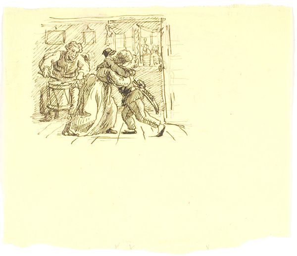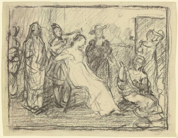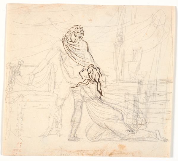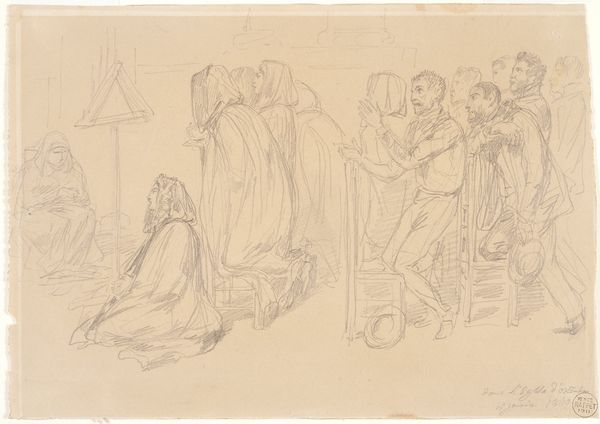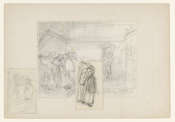 Editor: This is a drawing by Martinus Rørbye from 1847, titled "Kompositionsudkast til Kristi grav med de sovende soldater" – a compositional sketch for Christ's tomb with sleeping soldiers. It’s rendered in pencil, ink, and maybe some etching. I’m immediately struck by the contrast between the stillness of the sleeping figures and the suggestion of impending action, and curious about why such a common theme merits a "sketch" by the author. What’s your read on this piece? Curator: Well, considering Rørbye's social and historical context is vital. In 1847, images related to religious events, particularly around the resurrection, were powerful social and political tools. Who commissioned it, where it might have been displayed are questions that could enlighten us. Was Rørbye positioning himself within a specific religious or political movement through this piece? Editor: That's fascinating! I hadn't thought about the socio-political implications. Does the composition itself, with the soldiers depicted both asleep and alert, offer any clues? Curator: Absolutely. Think about the politics of imagery at the time. The sleeping soldiers, a clear sign of human failing in contrast with a central religious belief, challenge authority. Were those ideas palatable to the establishment, or did the artist face any social repercussions? Did the public see the soldier's slumber as laziness, human failure, or just humanity, juxtaposed against divinity? The staging of such scenes would certainly play to his patronage. Editor: So, the image becomes a point of dialogue between the artist, the patrons, and the viewing public. It's amazing how a simple sketch can hold so much historical weight. Curator: Exactly. The image transcends its religious subject matter and enters the public sphere, participating in broader conversations about power, belief, and representation, making visible complex negotiations. It is the museum's responsibility to create and host an enriching engagement with art! Editor: I never considered all the levels art could engage in the social consciousness; I have such a deeper appreciation now. Curator: Indeed. The interplay between artist, artwork, and audience offers unending avenues for discourse, and this sketch gives us insight to history through art.