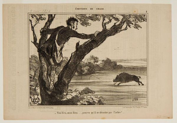 Curator: This drawing by Honoré Daumier, its title translating to, "Well then, Mr. Caboulot, aren't you coming? ...it's time to go home...", seems comical yet contemplative. Look at the cross-hatching! Editor: Yes, the lithographic marks speak to the printmaking process, but the work’s setting—a hunting scene and its leisurely class—is what I see first. This is about leisure, labor, and perhaps… exploitation. Curator: The composition's simplicity draws attention to the hunter’s pose and the tree’s texture. Daumier captures a moment of waiting, using line to convey light and shadow. Editor: And that waiting is borne of privilege, isn’t it? This isn’t just about aesthetics; it's about the social dynamics of 19th-century France. The materials available for leisure. Curator: Perhaps. Either way, a study in contrasts, visually engaging in its stark presentation. Editor: Indeed. A reflection on how class shapes perception, brought to life through simple lines.