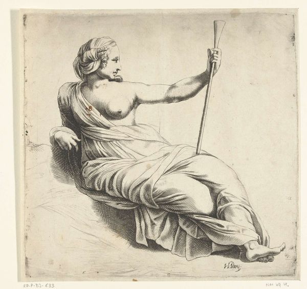 Curator: This pen and ink drawing, titled "Minerva," attributed to Pieter Yver, presents a compelling rendition of the Roman goddess of wisdom and warfare. It dates sometime between 1722 and 1787 and is currently held in the collection of the Rijksmuseum. Editor: My initial impression is one of poised command, but there's something almost domestic about the cross-hatching, which feels repetitive. What can you tell us about how this was crafted? Curator: Yver worked here primarily with line, creating both form and tone through hatching and varied linework, indicative of an engraving, a printmaking technique valued at the time for its reproducibility. Minerva's gaze, that resolute arm gesture – these are timeless visual signals of authority. Editor: Reproducibility points directly to its function: dispersing an ideal, shaping public perception. I’m also wondering about the labor that went into producing so many near-identical copies from a single plate. Did Yver have workshop assistants for that repetitive task, perhaps? Curator: The figure of Minerva here, she is instantly recognizable not only from her helmet and spear but through deeper cultural memory of Classical ideals that artists continually revisit, that give symbolic structure to virtue. The owl, a familiar of Minerva, also rests near her shield as a clear marker. Editor: But notice the way the material constraints of the pen and ink medium itself influences the final piece. The rather repetitive rendering of the drapery, for instance. I see a dialogue here between symbolic representation and material processes that I suspect was deeply ingrained in production at the time. Curator: These images are about establishing connections between virtue, military strength, and learned knowledge. That dialogue exists very much in her confident repose, and it says much about how societies visually encoded the virtues they valued. Editor: Agreed. Ultimately, whether mass-produced or not, the image's strength lies in its complex interplay: Minerva, ever poised between ideals of divine power and the reality of reproducible imagery on paper. The marks themselves tell a story of cultural values manifested materially through reproducible printing technologies.