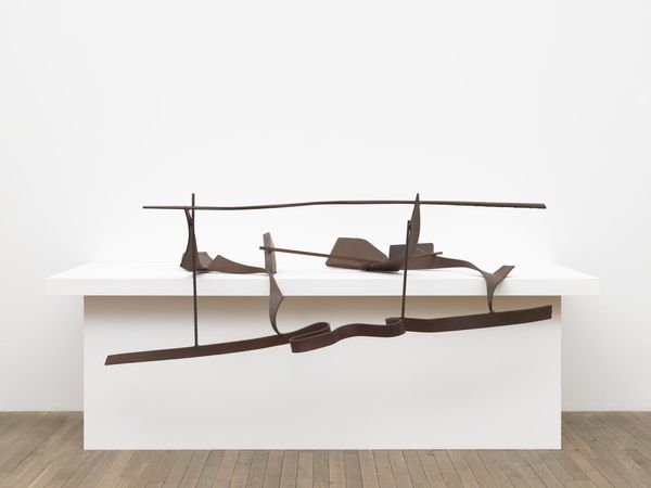 Editor: This is Sir Anthony Caro’s "Déjeuner sur l’herbe II" from the Tate collection. It’s a steel sculpture that feels both playful and grounded. What kind of visual symbols do you see at work here? Curator: The title points us to Manet's painting, suggesting a reinterpretation of leisure. Steel, though, replaces the soft forms of figures and fabric. Consider how the material itself changes the cultural memory of such a scene. What feelings does it invoke? Editor: It feels like a commentary on industrialization maybe? Less carefree and more... constructed. Curator: Precisely. The weighty steel and angular forms speak to a modern, perhaps more critical, understanding of our relationship with nature and leisure. The symbolism is transformed by the medium. Editor: That’s a really interesting point about how the material shapes the message. Curator: Indeed, the artwork's enduring power comes from its ability to reflect on cultural memory and the changing meanings of symbols.