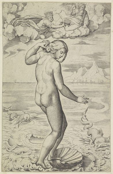 Curator: Standing before us is "Eve," an etching by Daniel Hopfer, likely created around 1522. It's rendered in print on paper, showcasing Hopfer's mastery of the etching technique. Editor: It’s striking how Eve averts her gaze, a gesture suggesting shame, or perhaps introspection, in the moment of decision. It really speaks to the moment right after, or perhaps during the act, or what follows the first sin, the banishment... Look at those skies up there... The dark-etched shading is like impending doom. Curator: The composition certainly evokes emotional weight. We must remember that this scene carries significant cultural meaning for a 16th-century audience. Hopfer, in depicting the biblical Eve, taps into existing iconography and understandings of feminine identity. Editor: Absolutely. This Eve exists at a critical nexus of theological doctrine and patriarchal anxiety. And what’s so interesting about how these images were being spread and used during the rise of printmaking to advance a clear, often dogmatic point of view. Was the choice to create an etching a matter of availability, or perhaps aesthetics, given it was only around 10 years into Hopfer doing such artworks? Curator: The medium, though utilitarian, amplifies its cultural penetration. Hopfer's etching demonstrates the power of visual rhetoric at the time, making theological themes more readily available and digestible for a wider audience, than maybe a painted mural in a church. The symbol is very present through form. It is there to be interpreted, decoded. Editor: Note how the nude figure becomes a subject of debate and social control through images in broad distribution like this. Think of how these prints entered the visual ecosystem of 16th century Europe, influencing perceptions of morality, gender, and faith. Curator: It's hard to believe that Hopfer probably used iron plates, a novel method, to create this depth and shadow, but one thing we know is the legacy of this symbolism continues. Editor: Indeed. Seeing how Hopfer’s work functions as a kind of mirror, reflecting societal anxieties about morality, knowledge, and representation itself, can enrich our understanding of the era. Curator: Definitely! The intersection of religion and societal structures, as embodied in visual forms, unveils continuities and transformations of symbols throughout history.