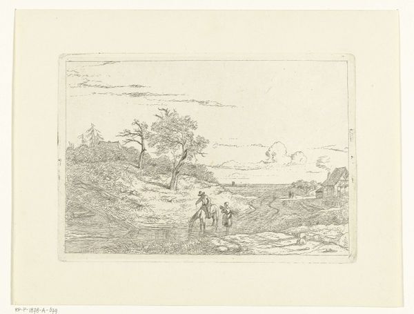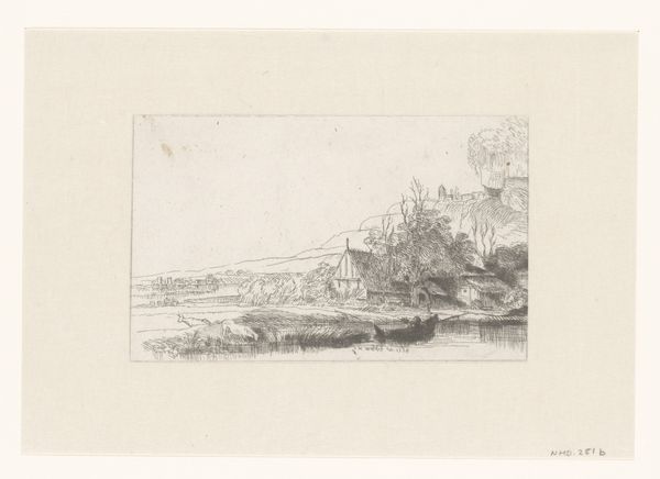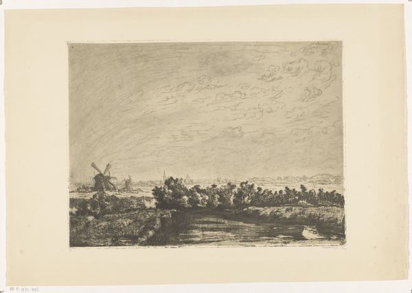Editor: This is "Landschap met rivier," a landscape with a river, an etching on paper by Laurent Verwey van Udenhout, dating to before 1945. It’s got a very calm and understated feeling, almost melancholic. How do you interpret this work? Curator: It's fascinating how the artist chose etching, a medium historically tied to reproduction and dissemination of knowledge, to depict a serene landscape. This connects the individual’s experience of nature to a broader social context. We should consider how landscape art often reflects a society's relationship to its environment, and access to land as power. What is visible, and who controls its representation, become essential questions. Do you get a sense of that from the piece, especially considering its pre-WWII creation date? Editor: That makes me consider the possible social implications reflected in this tranquil scene, considering the historical context of landscape as it relates to colonialism, industrialisation and capitalism. Though visually unassuming, the scene does communicate the tension and uncertainty that existed for many common people regarding issues of power. It reflects a shared reality and vulnerability. I’d always viewed landscape paintings as being removed from that conversation, though I realize now that its themes extend beyond aesthetics. Curator: Precisely! And that reflection encourages us to examine not just what’s depicted, but also the power structures that shape our perceptions of even the most seemingly "natural" scenes. Editor: Thank you so much for broadening my understanding, framing the artistic expression into its larger socio-political context! Curator: My pleasure! Considering art through that lens unveils powerful messages.