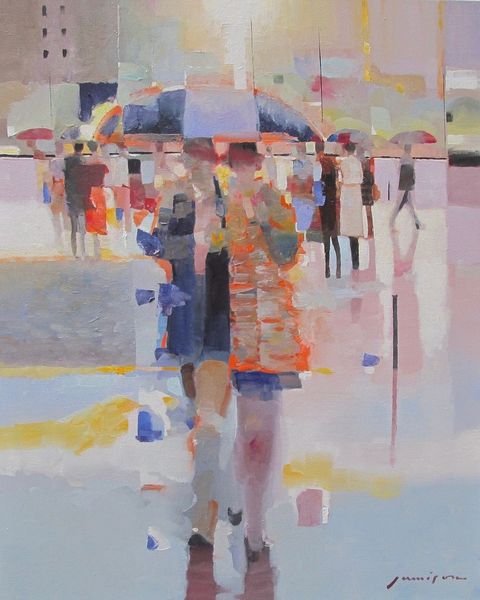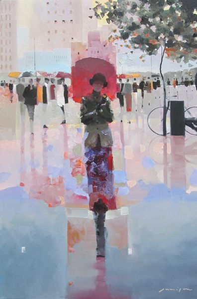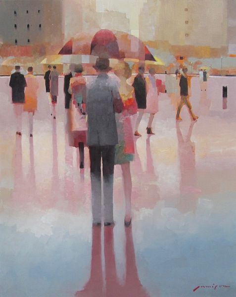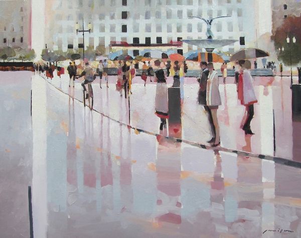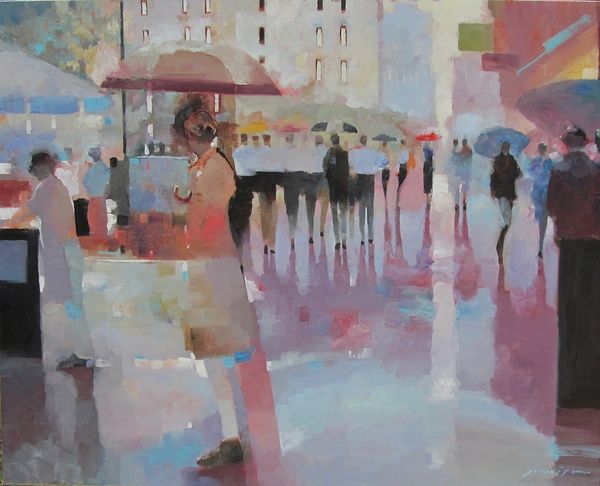 Jeff Jamison made this oil on canvas, titled "To Each His Own." Notice how Jamison captures the way we each experience public life through the lens of our own individual subjectivities. The muted color palette and blurred figures evoke a sense of transience and impermanence, which reflects the anonymity of city life. The figures here are generalized and archetypal, rather than portraits of specific individuals. This suggests the artist is more interested in exploring broader social themes than in representing particular people or events. Painted at the turn of the millennium, this artwork subtly critiques the social alienation and individualization of modern urban life. The title itself, "To Each His Own," speaks to this theme, highlighting the sense of detachment and isolation that can exist even in the midst of a crowd. To fully appreciate this piece, one might delve into the history of urban planning and its impact on social interactions. We can consider how the design of public spaces shapes our experiences and reinforces or challenges social norms. Ultimately, Jamison’s painting invites us to reflect on the complex relationship between the individual and society.