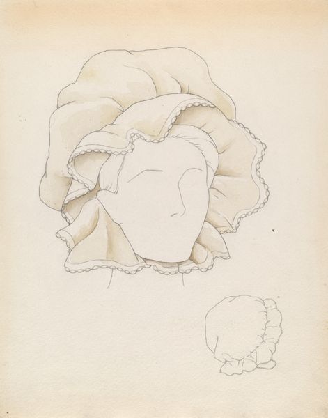 Curator: Here we have "Headdress," a drawing made around 1937. What are your first thoughts? Editor: The first thing that strikes me is its incompleteness; the blank face within the detailed bonnet gives it an ethereal, almost ghostly quality. Curator: That’s interesting, I read it more as a comment on identity and erasure, especially considering the period. The elaborate head covering situates a person firmly within a specific social role, defining and also confining them. What's left out of the portrait speaks volumes about those expectations, and the history that made them so compelling for women. Editor: I see what you're saying. The material itself - pencil on paper – also speaks to a certain level of accessibility, though. Was this possibly a preliminary sketch, maybe for a mass-produced pattern or guide? It appears it might be the sort of design made for distribution that ordinary folks would sew in their home. The little extra bonnet sketch suggests stages in pattern-making. Curator: Potentially. There is certainly a functionality communicated through the design elements and even its simplicity. Perhaps the drawing represents the accessibility you suggest, not just to create, but to be remade. The work almost begs the viewer to fill the face in according to their personal historical relationship to those constraints. In other words, maybe its very simplicity makes the question it asks more profound. Editor: That's quite insightful! Thinking about the construction... someone had to render each tiny ruffle, manage the angles on that bow, understand fabric drape… So much manual labor implicit within that image of a ‘domestic craft.’ It hints at a lot that the ladies who did it are mostly erased from the dominant narratives. Curator: Exactly! Even with such limitations placed upon women in both high art and domestic spaces, artistic expression and rebellion are made clear in this single drawing! Editor: Well, thanks to it now, and this chat. It’s made me appreciate how much material culture transmits unwritten histories, though it's not complete. Curator: Agreed, viewing it from both our perspectives, a small portrait drawing provides an entry point to discuss important feminist history!
