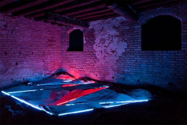 Curator: Here we have "Counterpoint with Flowers," a mixed-media installation created in 1982 by Füsun Onur. It's quite a remarkable example of environmental and site-specific art. Editor: It certainly is… jarring, isn't it? All that cerulean plastic trying so hard to be ethereal. But there’s something almost playfully subversive about the artificiality. It's like a stage set. Curator: Indeed. Onur’s work frequently plays with our perceptions of space and reality. This piece, like many of her others, challenges the traditional boundaries between artwork and environment. How do you interpret her intentions here? Editor: Intention... I see a world, or perhaps a dream of one. Everything is so intensely curated. The almost mournful single tree there, stark against the hyper-real blue… it’s almost Lynchian. A bit David Lynch meets, I don’t know, an underwater theatre production? Curator: An intriguing comparison. Considering the sociopolitical context of Turkey in the 1980s, with periods of political instability and military coups, could Onur have been constructing a commentary on idealized landscapes versus a harsher reality? Editor: Absolutely. The contrast could definitely represent that tension. That vibrant blue backdrop could symbolize the facade of optimism, concealing an unsettling underlying narrative that clashes with that bizarre fabric creature over there, barely able to hold itself up. The rock is what's really interesting. A moment of honesty. A paperweight in this surreal scene. Curator: That is insightful. Onur often incorporates found objects to disrupt the narrative and challenge our assumptions about value. In this context, the rock could represent authenticity. It anchors the piece while exposing artifice around it. Editor: A little rebel. Curator: Precisely. By transforming the gallery space into a carefully constructed tableau, Onur compels us to consider how art and environment shape and reflect society. Editor: For me, the genius of this piece is in its slightly awkward balance. It isn’t perfect; it leaves a sense of unresolved questions and hints at the underlying weirdness of things. Like a memory of a dream. Curator: Very well put. It's a powerful statement on perception, reality, and perhaps a touch of political commentary as well. Editor: Yes, it makes you consider the things you see, or the things you choose to. The stage is set; now, what story will we tell ourselves?
