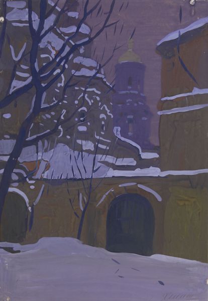 Curator: This is "Good Night for a Hunter," a 2020 acrylic painting by Timur Akhriev. At first glance, the color contrast alone creates a stark, somewhat lonely mood. Editor: It's so striking, isn't it? A cold indigo world ignited by these radiant golden rectangles, like windows into another reality. And a single, solitary figure… there’s a tangible quietness to it, yet it also hints at some grand narrative that has yet to unfold. Curator: Absolutely. If we focus on the composition, Akhriev positions the bare, snow-laden branches as almost a veil, drawing our eyes deliberately to the architecture and the lone figure beside it. It acts as a visual pathway that encourages close contemplation. Editor: I feel a chill looking at it! I want to say the emotional landscape, but physically—these violets in the snow are almost vibrating. I get that contrast, I love that it gives us clues about an underlying story. Curator: Precisely! Consider also the Fauvist elements at play: these liberated colors intensify the emotional atmosphere, rather than realistically depicting it. A world steeped in expressive possibility. The brushwork feels decisive yet organic. Editor: What story does that suggest? The "hunter" referenced in the title, is it symbolic perhaps? Maybe he’s hunting for solace, and isn’t a literal figure searching the wintery expanse of land. Curator: That's the intriguing mystery, isn’t it? The subject's identity or intent remains shrouded, which lends the whole scene an almost allegorical weight. There is also the animal; a predator. But it's ambiguous. What will he find? What are we seeing beyond an illuminated window? The neo-expressionist elements encourage a kind of emotional immediacy. Editor: The scale, with this vast darkness and little pops of light, are those the tracks of a beast on snow? Whatever Akhriev does with them, it feels quite potent. It suggests more questions than answers about night-time landscapes, or the hunt for purpose in dark hours. Curator: Exactly! The piece leaves us contemplating how we make light in the darkest hours and the mysteries contained in our quiet moments. Editor: A beautiful consideration for a 'good night', certainly something to hunt for on your next winter evening.