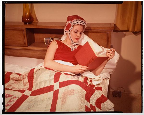Curator: This is an untitled photograph by Jack Gould, held at the Harvard Art Museums, depicting a woman holding her nightcap. Editor: There's such a sense of intimacy—it feels almost like glimpsing a private moment, that pre-sleep ritual. Curator: It's interesting how Gould captures the textures—the soft fabric of the nightcap contrasts with the smoother material of her pajamas, drawing attention to the tactile experience of preparing for bed. This photograph could be a reflection of labor, the daily ritual of rest. Editor: The nightcap is so evocative. Throughout history, head coverings have signified diverse things: protection, status, even modesty. Here, it feels like a symbol of transition—from day to night, from outward performance to inner peace. Curator: I agree, and considering how often sleepwear is now mass-produced, a handmade nightcap suggests a deliberate crafting of one's personal space and time. Editor: Yes, an intentionality. It makes me wonder about the dreams she might be inviting. Curator: It gives new meaning to the idea of the "materiality of dreams." Editor: Indeed. This image offers us a glimpse into something both intimate and universal.
