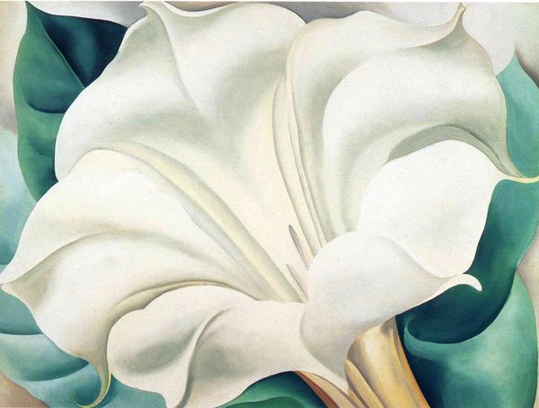 Curator: Immediately striking! The magnified, almost aggressively red petals… it’s really quite something. Editor: Yes, it is. We're looking at Georgia O'Keeffe’s “Red Snapdragons,” painted in 1923. It's an oil on canvas, depicting the flower on a monumental scale. Curator: "Monumental" is the word. I'm immediately thinking about the period she painted this, the Roaring Twenties, that radical sense of breaking from the past, an overwhelming sense of energy, really captured in this explosive use of scale and color. But what about you? What’s your take as you look at it? Editor: What I see is O’Keeffe really pushing at the boundaries of oil paint itself. The texture isn't perfectly smooth. You can almost feel the individual strokes and layers, this working of the pigment, a tension in building up form, rather than simply depicting it. What processes might she have used to apply these layers of oil? Was she interested in masking the labor? I suspect not. Curator: That's a great point. And what interests me about O'Keeffe, is how she, and Alfred Stieglitz, strategically positioned her as this kind of singular, almost mythical artistic genius, working in isolation to create these works of nature and feeling. Editor: Interesting that you call it nature. Look closely—notice how abstracted the forms are? It’s playing with the representational quality, right? Isn’t there an element of manufacturedness at play in these images? It isn't purely derived from raw "nature" as this unedited reality. Curator: Definitely! And I think that ties into O'Keeffe's role in shaping a uniquely American form of modernism. This move to abstract forms, a radical simplification that set her apart on the art stage of New York and beyond. But let's talk more about the color here, about the specific hues that grab us… Editor: This is clearly more than a red flower, isn't it? There are hues that verge toward deep pinks and even purples, they evoke depth and form...a play of dark and light within the single petals. I think we are getting to the bottom of how her meticulous application and mixing created such striking effect, this monumentality. Curator: It also calls into question, what were the means by which she made and distributed these monumental forms to become iconic American images? It seems like O’Keefe challenged traditional perceptions of the scale and what flowers represent culturally and artistically. Editor: In effect she reframed flowers altogether. By shifting how we approach production of imagery, perhaps we could move away from some art-historical narratives of who is a ‘genius’ to examining what ‘genius’ is and how it comes to exist!