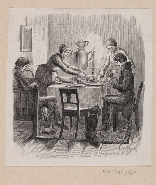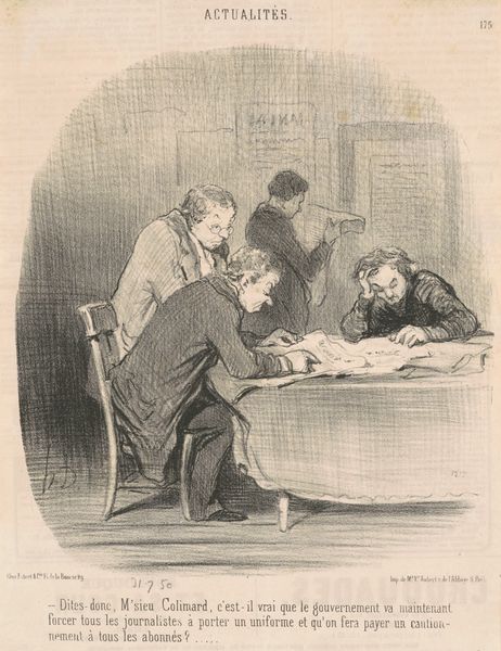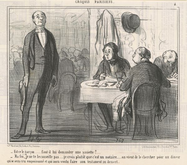 Editor: This pen drawing, titled "Triste sort des professeurs...", was created around the 19th century by Honoré Daumier. It feels satirical, with the swarm of insects and exaggerated features of the figures. How do you interpret this work? Curator: It’s intriguing how Daumier uses caricature here to highlight the plight of teachers, particularly within the rigid social structures of 19th-century France. The swarm of flies becomes a powerful metaphor for the distractions, the overwhelming burdens, and perhaps even the perceived worthlessness, heaped upon educators. The professor looks trapped, almost suffocated by the chaos. Where do you think the artist might have wanted to point out the satire? Editor: I think the way the students seem almost gleeful at the chaos, compared to the teacher's despair, really emphasizes the disconnect and perhaps the low social status of the teacher. Curator: Precisely! This visual disconnect forces us to consider the societal expectations placed upon teachers. Daumier often used his art as social commentary. It compels us to think about issues such as class divisions, institutional power dynamics, and the often-unacknowledged labor of educators. Editor: So, it’s not just a funny image, but a commentary on social inequalities and power structures within the education system at the time? Curator: Exactly. And perhaps even a call for change! How might those power structures resonate today? Editor: I guess I never really considered it beyond face value as a comedic illustration. Thinking about the social commentary aspect makes it more powerful. Curator: And that, perhaps, is the power of art: to spark conversation and incite change.
