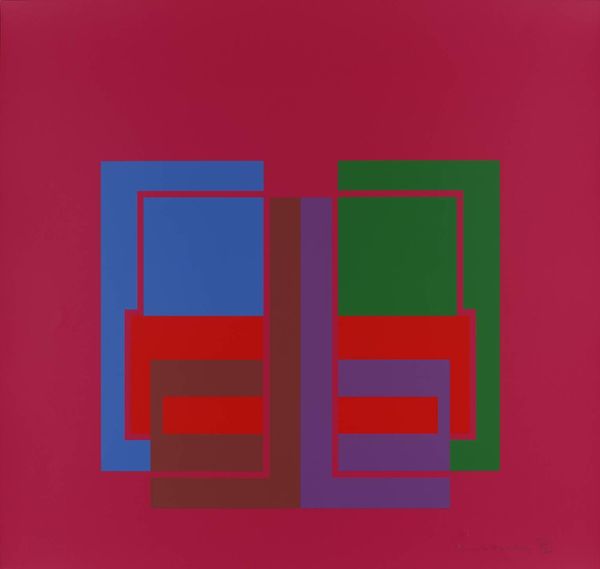 Editor: This untitled piece by Robyn Denny features geometric shapes and bold colors. It’s striking how the smooth surfaces contrast with the industrial feel of the shapes. What story do the materials and forms tell you? Curator: Considering Denny's work within post-war British art, I see an exploration of how industrial printing processes democratized art. The flat, unmodulated color fields remove the artist’s hand, transforming art into a mass-producible object. What implications does this have for the concept of artistic labor? Editor: That's fascinating, I hadn't considered the impact of production methods on the art itself. Curator: Precisely! Denny prompts us to question the division between high art and everyday design and its consumption.