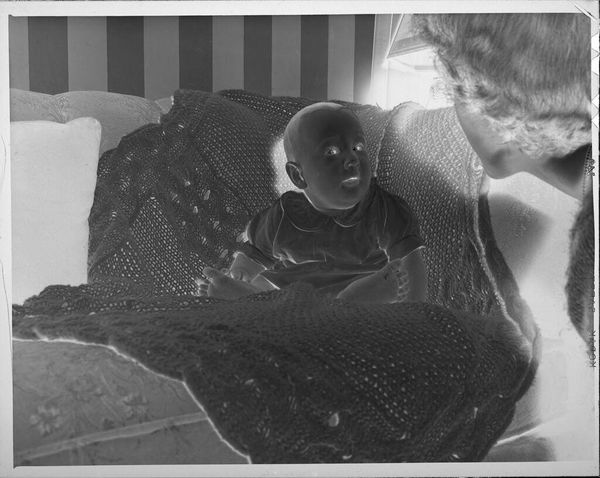 Editor: This is an intriguing black and white photograph of a girl with a doll and baby on a bed, by Lucian and Mary Brown. It feels like a staged moment. What do you see in this piece? Curator: It highlights the performance of gender roles within a domestic sphere. The girl mimics motherhood, reinforcing societal expectations placed on young women. Editor: So, it's not just a simple image of childhood? Curator: Precisely. Consider how this image might reflect the limited opportunities afforded to women during the time it was taken. What kind of narratives can be derived from this scene? Editor: It makes me think about how play can both reflect and reinforce societal expectations. Thanks for pointing that out. Curator: Of course. Understanding the social context helps unlock deeper meanings within the artwork.