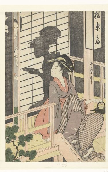 Curator: Here we have Suzuki Harunobu’s "Woman Running to Escape a Sudden Shower," a woodblock print in the collection of the Harvard Art Museums. It’s a chūban size, so fairly intimate in scale. Editor: It looks like a fleeting moment. The diagonal rain and her frantic gesture create a feeling of immediacy, like she’s been caught off guard. I wonder, do you feel an invitation to participate in her escape? Curator: The umbrella becomes a shield, doesn’t it? The image is charged with symbols of transition, from a peaceful stroll to a frantic run, from dry to soaked. It speaks to the impermanence of our best-laid plans. Editor: Right! And that umbrella—such a simple form, yet it becomes a stand-in for protection, a little personal haven against the downpour. Maybe we need to think about how often we search for these havens. Curator: It's a lovely meditation on the unexpected, and the grace with which we sometimes handle it. Editor: Exactly. It reminds us that beauty can be found even in the midst of a sudden shower—or whatever that shower represents in our own lives.