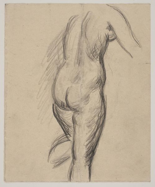 Editor: Here we have "Stående kvindelig model" a pencil drawing, believed to have been created between 1823 and 1923 by Vilhelm Lundstrom. The texture created by the pencil work seems almost tactile. What stands out to you most about this piece? Curator: The rapid, almost crude application of pencil immediately suggests a focus on process. Rather than idealizing the figure, Lundstrom presents the *making* of the image. It compels us to think about the economic conditions and the accessibility of materials that allowed for such an image. Is this a preparatory sketch, and what labor was involved for the model to stand for this sketch? Editor: So you are considering the act of drawing itself as a form of production? That’s interesting; it hadn’t occurred to me that way. I was just appreciating the simple lines, the shades of grey... Curator: Absolutely! Look closely; the quality of the paper, the specific type of pencil used, these all dictate the outcome and invite speculation. What socioeconomic factors dictated that the art was drawn on this support versus others? Editor: That shifts my perspective considerably! The sketch itself feels more like an object embedded in a specific time. Could Lundstrom have made it from a different material? Why did he select these material conditions? Curator: Precisely. Even the pose of the model -- who was she, and what were the labor dynamics implied by her posture and the artistic gaze? Think about the commodity exchange involved – time, materials, and artistic skill. Editor: So by considering the materials and the production context, we get a much richer, socio-economic reading of what might seem like a simple nude sketch. It highlights labor and context over aesthetics alone. Curator: Exactly. We’re acknowledging art making as work. We see the decisions of the artist and are allowed to consider a broader scope about society.