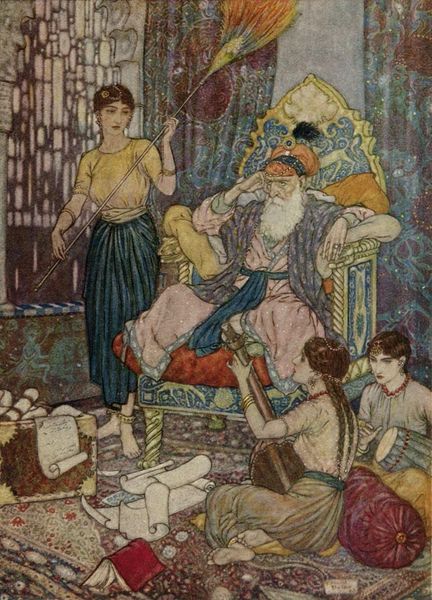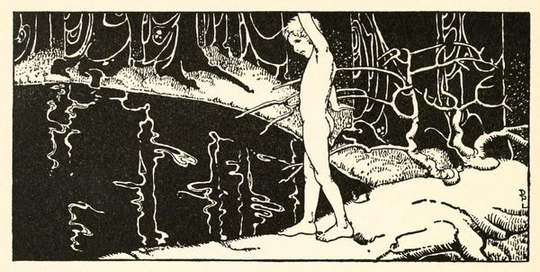This is an illustration for Fairy Tales For Adults by Artuš Scheiner. Notice the woman's gesture with her arms raised, framing her head. This pose echoes the ancient "orant" figure, seen in early Christian art, a gesture of prayer and supplication, yet here, it's imbued with a sense of vulnerable display. The crown upon her head and the minimal clothing point to themes of exposure and power, of being both sovereign and subject. Consider how this gesture, though rooted in religious entreaty, resurfaces in secular contexts. In theatrical performances and even mundane expressions of surrender, the raised arms persist, yet the meaning shifts. It is as if the collective memory retains the primal, emotive force of this gesture, re-encoded across time. The interplay of the sacred and the profane creates a captivating tension, engaging us on a primal, subconscious level, as these archetypal symbols evoke profound emotional states.