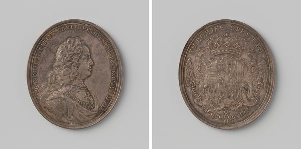 Curator: We’re looking at a dual portrait here, struck in metal by Anton Meybusch in 1699. The artwork is called "Frederik IV en Louisa, koning en koningin van Denemarken," portraying the King and Queen of Denmark. Editor: Immediately striking—it’s a study in the restrained power of the baroque. The metallic sheen enhances the gravitas, and the stark profiles emphasize their status. Curator: Absolutely. These profiles are deliberately designed to convey power. We see meticulously rendered details in their hair and clothing. The textural contrast is key, from the smooth background fields to the intricate curls and fabric folds. Editor: Notice also the direction they face—a visual suggestion of balance, perhaps of partnership. Each figure is surrounded by inscribed text... it's fascinating how written language and imagery come together to declare authority. Curator: The inscription functions both as a descriptor and an emblem of sovereignty. Consider also the material. Metal, a durable medium, speaks to the timeless ambition that rulers so often crave. Its circular form suggests completion and, indeed, their reign. Editor: Indeed. Circles are enduring symbols in many cultures. The carefully rendered details – the crown and the Queen’s elaborate brooch, become iconic representations, designed to embed themselves in the viewer's memory. This piece serves as cultural propaganda on a miniature scale. Curator: Well said! We can think about this artwork in terms of binaries too. Figure and ground, male and female, inscription and image…Meybusch masterfully controls the visual dynamics. It creates a stable but potent representation. Editor: And I find that consideration allows us a more nuanced appreciation for how portraiture creates cultural legacy through deliberately crafted symbols and the enduring quality of artistic production. Curator: A comprehensive outlook, thank you! It illuminates how formal composition supports ideological projection, which is ultimately very persuasive.
