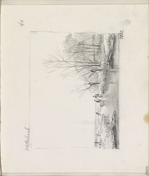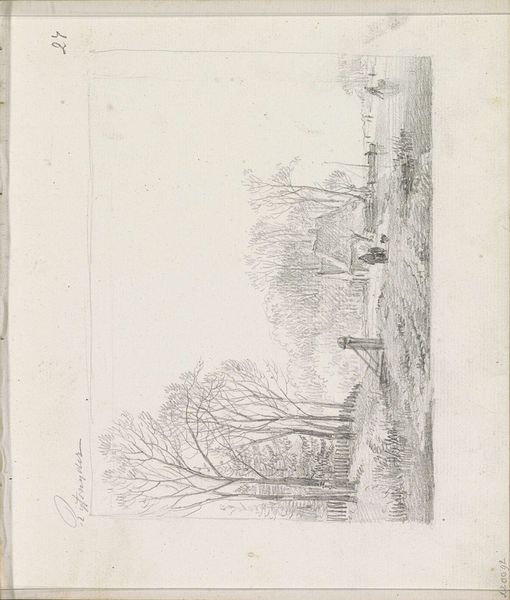 Curator: What a delicate pencil sketch. The initial impression is one of hushed stillness. Editor: Andreas Schelfhout rendered this drawing, entitled "Skaters on a Frozen Canal by a Farmhouse," sometime between 1825 and 1829. The Rijksmuseum holds it within its collection. What aspects stand out to you beyond its quietude? Curator: The tentative strokes—they hint at social divides. This wasn't intended as a finished, polished artwork for public consumption, more like a private musing reflecting daily life, which offers a privileged, behind-the-scenes insight into the rural Dutch landscape of that era. Editor: I agree it provides access, though I'd say such works help constitute national identity itself. Schelfhout played a crucial role in popularizing winter landscapes, establishing a visual repertoire through which the Dutch collectively imagined themselves and their relationship to their environment. Curator: You bring an important point regarding visual language formation; however, who was, and is, actually *included* in this "collective imagination"? The idyllic scene normalizes specific experiences, class positions, potentially excluding those outside the dominant social group reflected. Editor: Certainly, the Romantics had a tendency to aestheticize rural life, overlooking social disparities. Schelfhout’s works were consumed mostly by the bourgeoisie. His work was often commissioned by them. Curator: It is important that we keep that context in mind as we view this art. His images reflect, at least, an intention to offer comfort to a patron, a specific consumer. Editor: Absolutely. These winter scenes often served as comforting symbols of national pride, masking deeper social and political tensions, particularly during times of upheaval. Curator: Looking at it, I’m aware of how art can perform multiple functions: documentarian, aesthetic, ideological, personal and political statement, commodity—it all converges. Editor: Precisely. Analyzing such sketches gives us glimpses into the artist’s process, social conditioning, and the formation of a distinctly Dutch artistic identity, so valuable in this setting. Curator: Yes, through it, it does give way to further explorations of how we, as society, are viewing this art. Editor: Well said! Thanks for sharing your perspectives!
