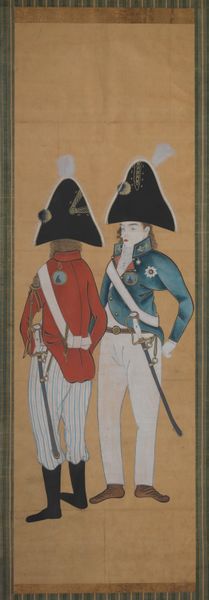 Editor: So this is *Russian Admiral*, from the early 19th century. It’s watercolor and ink on paper. It looks so serene and yet…almost comical with that hat. What should we be looking at here? Curator: It's intriguing how the symbols of power and authority – the uniform, the sword – are presented in such a naive style. The large hat, almost cartoonish, draws attention. It's as if the artist is intentionally playing with the codes of Romantic-era portraiture. What do you think the pink sash represents? Editor: I'm guessing some sort of honor or achievement? Medals? Curator: Precisely. That sash and the cross denote high status. Yet, consider how simply they're rendered. The artist employs a certain flatness, defying the era’s convention of deep shadow and realistic texture. I find myself thinking, is it a celebration of Russian naval power or perhaps a subtle critique of its pretensions? Notice anything else that stands out? Editor: He looks so young. And his feet look tiny! Curator: His youth might emphasize the Admiral’s rise, a symbol of hope for Russia. But that brings us to the uncomfortable question of the positionality and identity of the artist. Does the naïveté spring from something else entirely? Do you notice any affect the border creates for you? Editor: That marbled edge, like old book covers. Curator: Yes! I believe the edge contains meaning too, don't you? Like the Admiral is held inside Russian memory and history. What else does it whisper to you? Editor: Hmmm, it also highlights how 'contained' he looks in this portrait. Thank you! It gives me a lot to consider. Curator: Indeed, understanding this painting involves unraveling cultural memory through its seemingly simple imagery. I found our talk illuminating!