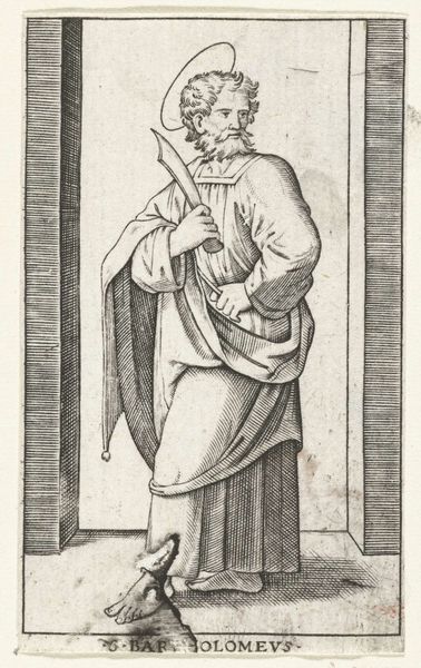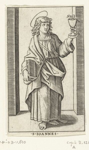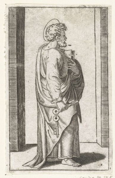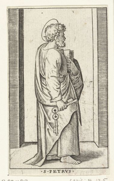Editor: This engraving, "Apostle Peter with Keys," by Marcantonio Raimondi, dates from 1517 to 1527. It feels quite austere to me, with a very clear, linear style. What can you tell me about how the artistic approach contributes to the meaning here? Curator: Note the primacy of line. Raimondi meticulously articulates form through an accumulation of precise, unwavering lines, foregoing chiaroscuro in favour of clarity. Observe how the drapery folds are defined not by shading but by densely packed parallel lines. This serves not merely to depict the subject, but also to highlight the constructed nature of the image itself. The engraving insists on its materiality, the marks on the plate that give rise to the image. Editor: So you are suggesting the technique calls attention to itself, rather than disappearing in service to naturalism? Curator: Precisely. Consider the architectural frame around the figure, delineated with unwavering verticals and horizontals, mirroring and emphasizing the lines used to depict Saint Peter's robes. The repetition creates a sense of enclosure, directing focus onto the formal relationships within the image rather than narrative context. Editor: That's a very interesting reading. I was so focused on Saint Peter himself, but seeing the emphasis on form itself opens up the whole piece. Curator: Indeed. By emphasizing the formal structure of the work, we move away from the purely representational towards an appreciation of the artistry inherent in the engraving process. Editor: I will certainly look at prints differently now. Curator: And I hope with an added awareness to the formal structures in which meaning can be conveyed.