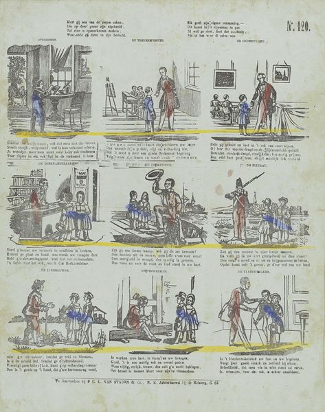 This print by P.C.L. van Staden Czn., title Neemt, kleinen, neemt vrolijk, beziet deze Prent, was made at an unknown date using an unknown medium. It's a fascinating window into Dutch popular culture. The print, divided into twelve scenes, depicts the wedding of Kloris and Roosje, a popular subject for children's books and prints in the Netherlands. The scenes showcase different stages of the wedding celebration, from the couple's arrival in a horse-drawn carriage to the festive dancing and dining. What makes this print particularly interesting is its function as both entertainment and moral instruction. The accompanying verses offer lessons on marriage, family, and social harmony, reflecting the values of Dutch society at the time. To understand this artwork more fully, we might explore the history of Dutch printmaking, popular literature, and wedding traditions. These resources can help us contextualize the image and appreciate its role in shaping cultural norms and values.