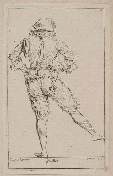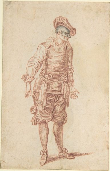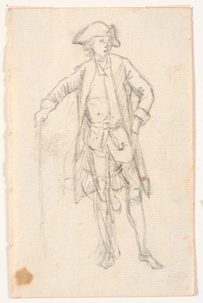 Curator: Before us, we have Giovanni Battista Piranesi's "A Gentleman with a Walking Stick," a pencil drawing dating from the early 1750s. Editor: What strikes me immediately is the man’s precarious stance, like a puppet whose strings have been cut. Is this perhaps a subtle critique of aristocratic performativity? Curator: It’s intriguing to interpret it that way. From a purely compositional standpoint, the loose hatching creates a sense of movement, or perhaps instability. Look at how the lines define the form of his coat and legs; they seem almost provisional, incomplete. Editor: Incomplete perhaps, but powerfully evocative. The pointed hat and almost dismissive gesture—they whisper stories of a class on the verge, maybe losing its grip on power in the face of societal changes, even revolution. The stick, usually an emblem of power, here droops. Curator: That's a valid interpretation, situating it within the context of its time. Structurally, the drawing masterfully uses contrast. Notice how the lighter areas around the figure's face and hat draw our eye upward, a focal point amidst the scumbled texture elsewhere. Semiotically, that could symbolize enlightenment...or maybe vanity, given his elaborate attire. Editor: Or a satirical nod to the elaborate costumes and pretensions of the upper class! And this piece emerges, remember, during a period when the chattering classes had already begun to hold the monarchy and their hangers-on to public account through various increasingly popular art forms. Is this art about those new class relations and new media, maybe even? Curator: An interesting proposal. What seems clear, irrespective, is how Piranesi balances detail and suggestion. The economy of line, the areas of blank space, invite the viewer to complete the image, to engage actively. Editor: Indeed, we see the sketchiness almost becoming the subject—the very ephemerality suggesting not permanence and grandiosity, but transient, slipping authority. It brings out the idea that every identity can feel, and become, undone at any moment. Curator: Considering this gentleman’s world upended by the currents of history offers a resonant reading of this fascinating sketch. Editor: Precisely, and with those shifting meanings of class, this work becomes not just a study but a challenge to the viewers on their own ideas about power and status.