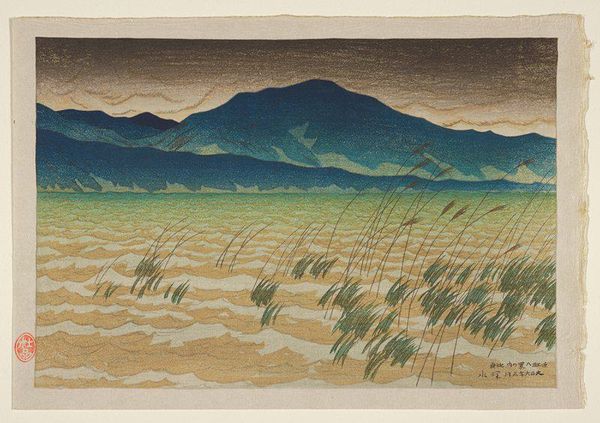 Curator: This is Utagawa Hiroshige's "Tamagawa Village," part of his series "Famous Views of Edo." Look closely at the subtle variations in the paper and the delicate pigments. Editor: Oh, it feels like a dreamscape, doesn't it? Ethereal and distant, yet grounded by that strong horizontal composition. Curator: Indeed. Hiroshige's printmaking process involved a collaborative effort, from the artist's design to the woodblock carver's skill, and the printer's application of pigments. Notice the role of water and its relation to Edo society. Editor: Exactly! You can almost smell the river and feel the cool breeze. I'm transported... it's melancholic, yet serene. He truly captured a feeling. Curator: It's fascinating how the mass production of these prints made landscapes accessible, transforming both art and travel culture for a wider audience. Editor: It's still capable of sparking that sense of wonder and nostalgia. Curator: Absolutely, a testament to the complex interplay of labor and artistic vision. Editor: The way you've described the creative process makes me appreciate it even more.
