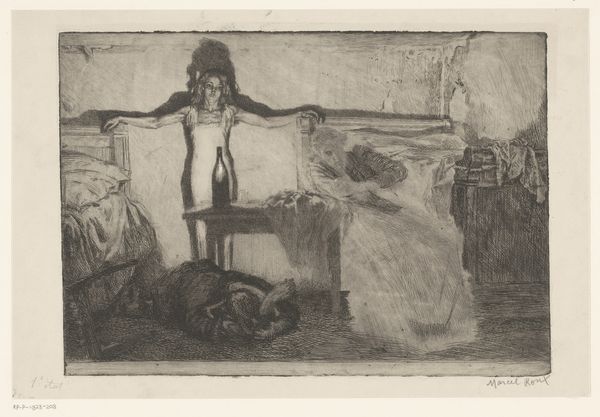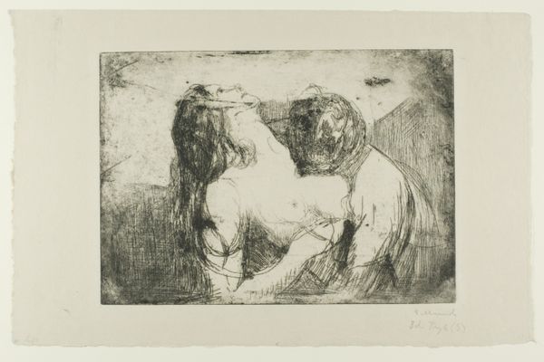 Editor: This is Edgar Degas’ "Leaving the Bath," made between 1879 and 1880. It's an etching and drawing printed with ink on paper, currently residing at the Art Institute of Chicago. I am really struck by the sketchy quality. What can you tell me about it? Curator: It’s an interesting example of Degas grappling with the means of production and his movement between perceived "high" art like painting, and what was deemed craft or reproductive art through printmaking. The visible process of etching and drawing breaks down hierarchies. Think about the materials themselves: the metal plate, the acids used to bite the image, the paper sourced for printing. Each step reveals labor. Editor: So, it’s a conscious act of exploring the "making of" art, rather than just depicting a scene? Curator: Precisely! Consider the social context too. Who owned these prints? Were they widely accessible, and how did the subject matter - a woman bathing - influence their consumption? It shifts the gaze away from the romanticized nude to a more observational and, arguably, a commercially viable representation of the everyday. Editor: Interesting! I was so focused on the Impressionistic style that I didn't think about the process and its social implications. Curator: It’s a dialogue between the act of creation, the inherent value – or lack thereof – assigned to materials, and its exchange within a consumerist society. Thinking about art from that vantage point can unlock entirely new sets of questions. Editor: This makes me appreciate Degas’ choice of printmaking for this particular subject even more. Thanks! Curator: It gives you an alternate understanding that focuses on how materiality is critical, while creating more queries and different angles to appreciate.