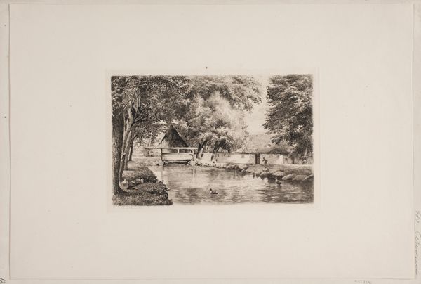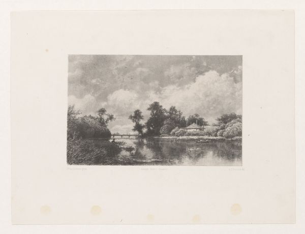 Editor: Here we have "Cows in River Landscape," an etching by Adolf Carel Nunnink, created sometime between 1863 and 1883. I'm really struck by the detail he achieved using only etching – it's almost photographic in its realism. What jumps out at you? Curator: It's the structured arrangement of forms, isn't it? Notice the careful balance between the density of the trees on the left and the open expanse of the river on the right. Consider also the strategic placement of the cows within the composition. What compositional strategies can you see? Editor: Well, there's definitely a foreground, middle ground, and background. The reeds sort of lead my eye into the river and towards the cows in the distance. Curator: Precisely! And how does the use of light contribute to this sense of depth? Editor: The reflections on the water certainly add to it, making it seem more three-dimensional. It almost creates a mirror effect in the center, with the clouds reflected perfectly. Curator: Notice how the artist plays with the textural differences - the sharp, vertical strokes of the reeds contrast with the smoother surfaces of the water and the sky. It's a deliberate use of line to differentiate forms and enhance the overall visual impact. Editor: So it's not just about what's depicted but *how* it's depicted. I see it now! Thanks for helping me explore the framework and intrinsic elements that compose this piece. Curator: It's been my pleasure to unravel Nunnink’s strategy through its forms and textures with you!