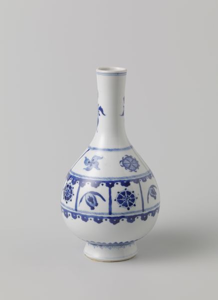 Curator: This is a pear-shaped bottle vase, a piece made between 1680 and 1720, so the late 17th or early 18th century. It’s currently housed here at the Rijksmuseum. The piece, made anonymously, is crafted from porcelain and stoneware and showcases intricate decorative art. Editor: Immediately, the blue against the stark white gives me this chill, pristine vibe. It’s almost as if this vase could hold whispers of forgotten seas or maybe just my favorite kind of gin! Curator: That sense of maritime connection is quite perceptive. These blue and white ceramics were crucial components within the early modern trade routes linking East Asia and Europe. The symbols decorating the vase would've likely held cultural and auspicious significance, both to its makers and those commissioning such work. What layers of cross-cultural meaning can we disentangle from a porcelain vase? Editor: Layers upon layers. I see these motifs swirling around and start to wonder, who chose them? What did they hope to evoke or manifest with these artistic decisions? Did the owner get a say, or was it entirely in the artisan’s hands? This dance between utility and spiritual intention is quite powerful here. I bet this piece had conversations going around. Curator: Absolutely. Porcelain held immense economic and symbolic importance during this era, representing not only artistry but also global exchange, cultural contact, and colonial power dynamics. Understanding porcelain helps us engage with broader historical issues involving intercultural aesthetics, status, and trade monopolies that significantly shaped socio-political relations of that time. It invites critical reflections regarding appropriation. Editor: True! And honestly, if this vase could talk—can you imagine? The tea it’s seen, the secrets it’s heard. But on another note, does it feel kind of...balanced to you? Even though it’s ornate, it's calming. Like an ocean you just can't stop watching. Curator: Yes, indeed. Its aesthetic invites meditative consideration regarding not only what is directly depicted on the vase, but it also draws awareness to underlying power structures shaping production. Editor: Beautifully said. I guess, for me, beyond all the historic considerations—which are huge—it makes you think about the things we surround ourselves with, what stories do they carry, or what dreams do they secretly nurture? It also reminds me, blue is eternally chic. Curator: A sentiment to which I heartily agree! Thinking through decorative arts this way provides critical understanding connecting material aesthetics and sociopolitical contexts relevant to our ongoing concerns today.