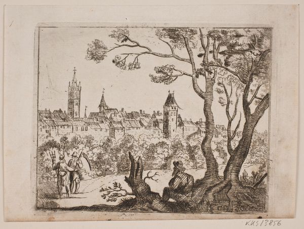"Gotisk Kirke" is an etching made by Johan Bülow, sometime between the late 18th and early 19th centuries. Bülow was born into the landed gentry and served as a knight in the Order of the Dannebrog, so his position within Danish society afforded him the freedom to pursue artistic interests, such as this one. The print depicts an idyllic scene of rural life complete with a gothic church, a bridge, and various figures. It subtly engages with the prevalent artistic trends of its time, such as Romanticism which emphasized the beauty of nature and the sublime power of religious architecture. It represents an idealized vision, where class divisions seem softened by the shared experience of the natural world. The detailed etching technique captures the textures of the trees and the stone of the church, inviting viewers into this tranquil landscape. This artwork serves not just as a visual representation but as a cultural artifact. It reflects the values, aesthetics, and social structures of the time, quietly inviting us to consider the historical narratives embedded within.