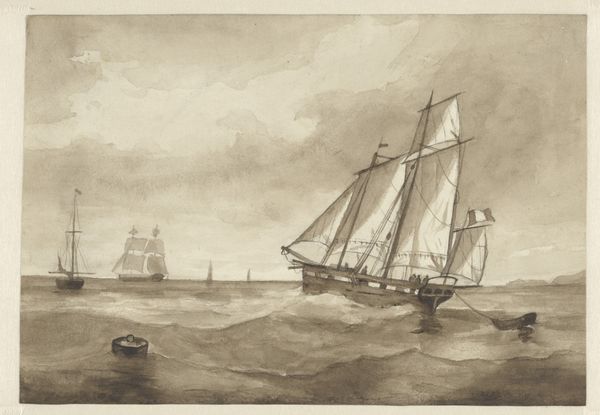 Curator: This watercolor, entitled *Ships Near a Headland*, by Willem Witsen, invites contemplation of the Dutch maritime past. The artwork resides here at the Rijksmuseum, inviting closer examination. Editor: My immediate sense is one of tranquility. The muted color palette and delicate brushwork create a serene atmosphere, though it’s also slightly melancholic. Curator: Absolutely. Maritime settings like these held deep cultural significance in the Netherlands. Ships were the arteries of trade and symbols of Dutch power and global reach. Notice how even in a seemingly placid scene, there's an awareness of movement and the promise of journeys. Editor: I'm drawn to the composition—the prominent ship on the right is balanced by the distant ships on the horizon and a strange sign on the left bank. This division creates a sense of depth but also spatial ambiguity. Curator: Yes, the signpost is interesting. They guided seafarers. Their placement was not arbitrary. Each symbol held cultural weight for those sailing the waters of the time, imbuing the landscape with a kind of communicative agency. Editor: Semiotically speaking, the sails capture light. In terms of brushstrokes, notice how each reflects light; the luminosity within the dark and grey watercolour. Curator: You’ve pinpointed something essential. Witsen, using a seemingly limited palette, evokes a profound sense of atmosphere and perhaps the collective experience of the sailors who embarked upon similar voyages over time. It reminds us of the emotional investment a society can pour into these symbols. Editor: Well, it speaks volumes. I can see how Witsen distills a whole network of relations into such a peaceful visual. Curator: Looking at this piece, I am also reminded how symbols embedded within our landscape shape our understanding of history. Editor: Exactly. As viewers, we can find space to question our historical assumptions. Curator: Witsen helps reveal continuity through his brushstrokes, inviting a dialogue between the past and the present.