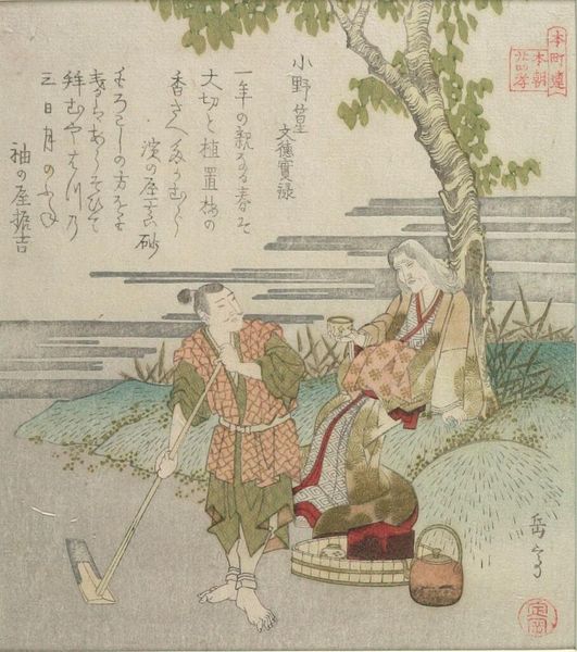 This print, Twenty-four Japanese Examples of Filial Piety, was made by Yashima Gakutei in 19th century Japan using woodblock printing, a demanding process with a long history. Consider the labor involved: each color needs a separate block, carved with precision, and aligned perfectly for printing. This wasn’t just a technical exercise; it was a cultural act. The image depicts a son tending to his elderly parent, a visual sermon on the importance of familial duty. The print's soft colors and delicate lines, achieved through skilled carving and printing, stand in contrast to the hard work of the son. The artist is using the print medium – inherently reproducible – to disseminate this message widely. It's a potent reminder that even in the most intimate family relationships, labor and social expectations are always at play.