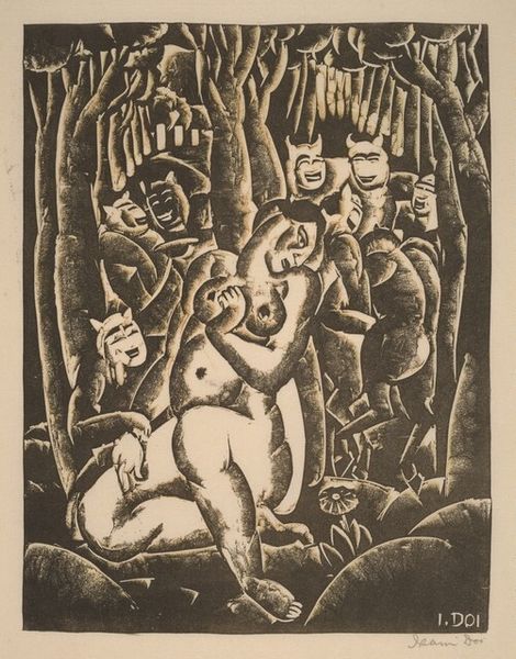 Editor: This is Theo Hios's "Pipe Workers," an etching from 1938. I’m struck by how claustrophobic the scene feels, even though it's supposedly an open landscape. There’s so much darkness and intense labor depicted. What visual narratives or cultural echoes do you see embedded in this work? Curator: I see a powerful visual document laden with symbolism. Notice how the dark, almost oppressive background contrasts with the figures themselves. These are not idealized workers; their bodies are strained, their postures indicative of grueling physical exertion. What do the tools - the hammer, the pipes - remind you of, beyond their obvious function? Editor: Hmm, beyond their function…perhaps symbols of progress, but also of the harsh realities of industrial labor? The weight of those pipes seems significant. Curator: Exactly. They represent progress, certainly, but also the often-unseen human cost of that progress. The underground setting is crucial. It's a subterranean world, hidden from the shiny surface of modernity, where these men are almost mythical figures toiling in the depths. Does the composition remind you of anything? Editor: Maybe a classical frieze? There's a certain timelessness to their poses despite the industrial setting. Curator: Yes! And what of the light and shadow? Notice how it highlights their musculature but also obscures their faces, rendering them almost anonymous. Are they individuals, or representatives of a class? Think about how that visual choice shapes our perception. Editor: That’s a compelling point. It shifts them from individuals to symbols themselves, echoing broader themes of labor and sacrifice. The darkness almost feels like a metaphorical weight on their shoulders. Curator: Precisely. By understanding how these elements converge, we unlock the work's enduring power and relevance. What starts as a simple scene of labor unfolds into a potent meditation on the human condition, the burdens we bear, and the hidden foundations upon which society is built. Editor: I hadn't considered how deliberately the artist was employing those visual cues. Thank you, this has really reshaped how I view this print.