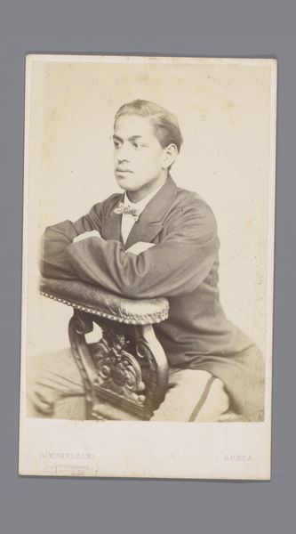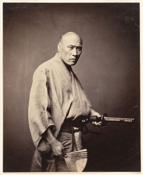 Curator: Welcome. We’re standing before Raimund von Stillfried's photographic portrait, “Soldat de la ligne,” taken in the 1870s. It's a fascinating example of how photography intersected with orientalism at the time. Editor: Instantly, there’s something melancholic about this image. The soft focus and muted tones give it a dreamy, almost unreal quality. It feels more like a memory than a photograph. Curator: The portrait definitely captures a staged exoticism, which was very fashionable then. Yet, the image is still full of symbolic and cultural weight, documenting an Asian soldier during a tumultuous period. Consider the historical role and implications suggested by the uniform and hairstyle, indicators of ethnic identity in conflict with external perceptions. Editor: He almost looks like he's playing a role. Is it the setting or his direct, slightly apprehensive gaze that lends itself to this staged interpretation? What's hiding behind his eyes, I wonder? It seems we, the viewers, are placed in the role of observers. Curator: Indeed. His outfit hints at a sort of cultural performance that reinforces Western fascination with the 'Orient'. But, to your point, notice how Stillfried's photographic technique and staging, coupled with the soldier’s own self-presentation, create multiple layers of interpretation. How do you read that cultural exchange or collision in the photographic process? Editor: Collision is the exact word for it. This collision produced such captivating images of what someone *imagined* Asia to be back then. Despite its constructed nature, you almost forget about the potential exploitative undertones in this stunning image, due to the humanity it still captures. It makes me think about authenticity, representation, and whose gaze really matters in such an image. Curator: Absolutely, I’d say that “Soldat de la ligne” invites us to consider not only the subject it portrays but also our own assumptions about history, representation, and cultural identity when seeing a striking photo like this. Editor: A beautiful reminder of how complex even a seemingly simple portrait can be, right? So many invisible narratives interwoven into the visible.