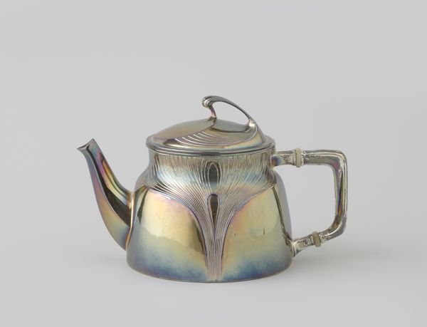 This is Orivit's Warmwaterkan. Its date is unknown, and it was made with tin. The water jug presents a visual experience dominated by smooth, reflective surfaces and a refined streamlined form. The silvery-grey tones create a cool, metallic aesthetic. Observe how the jug’s design incorporates a stylized floral motif. Vertical lines extend from the base, converging towards the top in a subtle, organic rhythm. This reflects an Art Nouveau aesthetic, where nature’s forms are abstracted into elegant, linear patterns. The artist uses these lines and shapes to explore the tension between functionality and decoration, between the industrial material and the natural form. This object exists as a piece of functional art. Consider how the formal qualities of the jug—its shape, lines, and reflective surface—challenge traditional notions of utility. It is a functional item, but also a symbolic object of taste.